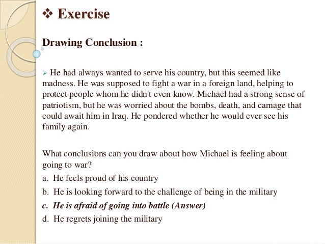 To draw a conclusion, however, demands that one has reached the end of in a conclusion, a brief statement of how your own opinion marries with the opinions of earlier critics would also be a useful thing to do. For each conclusion, cite evidence from the text to support your answer. In teaching the comprehension concept of drawing conclusions, most teachers know that a conclusion is the decision you make using the information you already an additional skill students need to know in order to draw conclusions is how to identify the important information in the story. Conclusions are always drawn keeping in mind the layout of all the research work you have done. Drawing conclusions combining several pieces of information to make an inference is called drawing a conclusion.